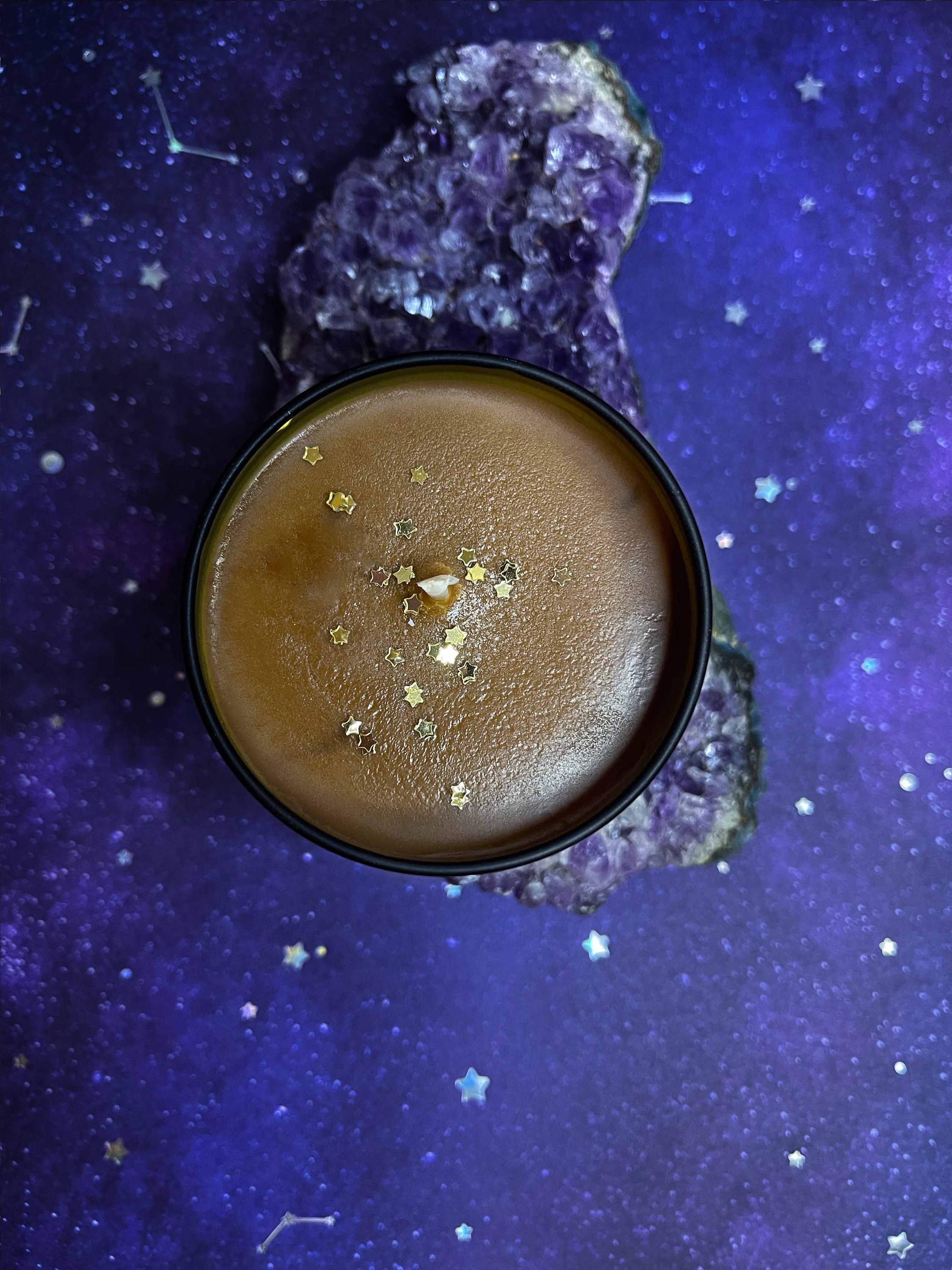 Each candle is hand-poured with all-natural soy wax and premium fragrance oils. Our products are made and set to cure before being sold, and individually labeled and finished by hand. These 4oz candles have a burn time of 20+ hours and have the perfect scent throw for an average-sized room. They come in a black tin jar with a luxurious mirrored holographic gold label. Each lid is finished with a gold wax stamp protection circle.