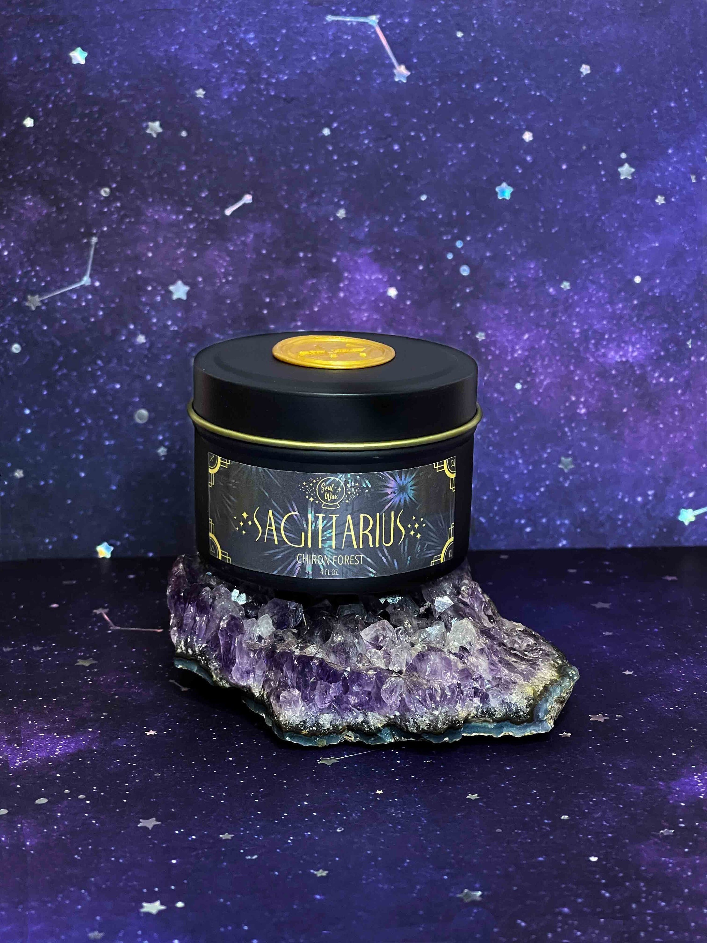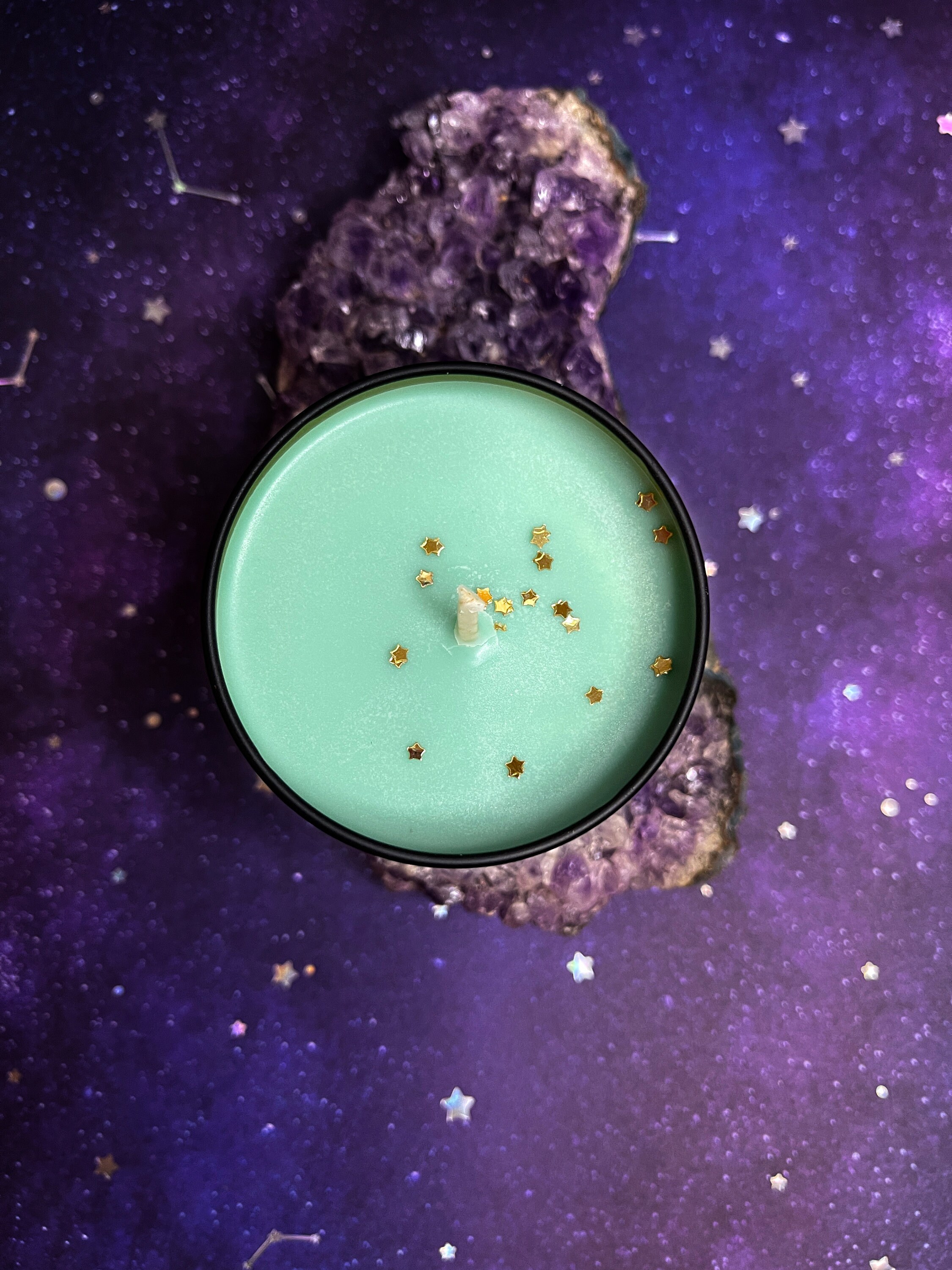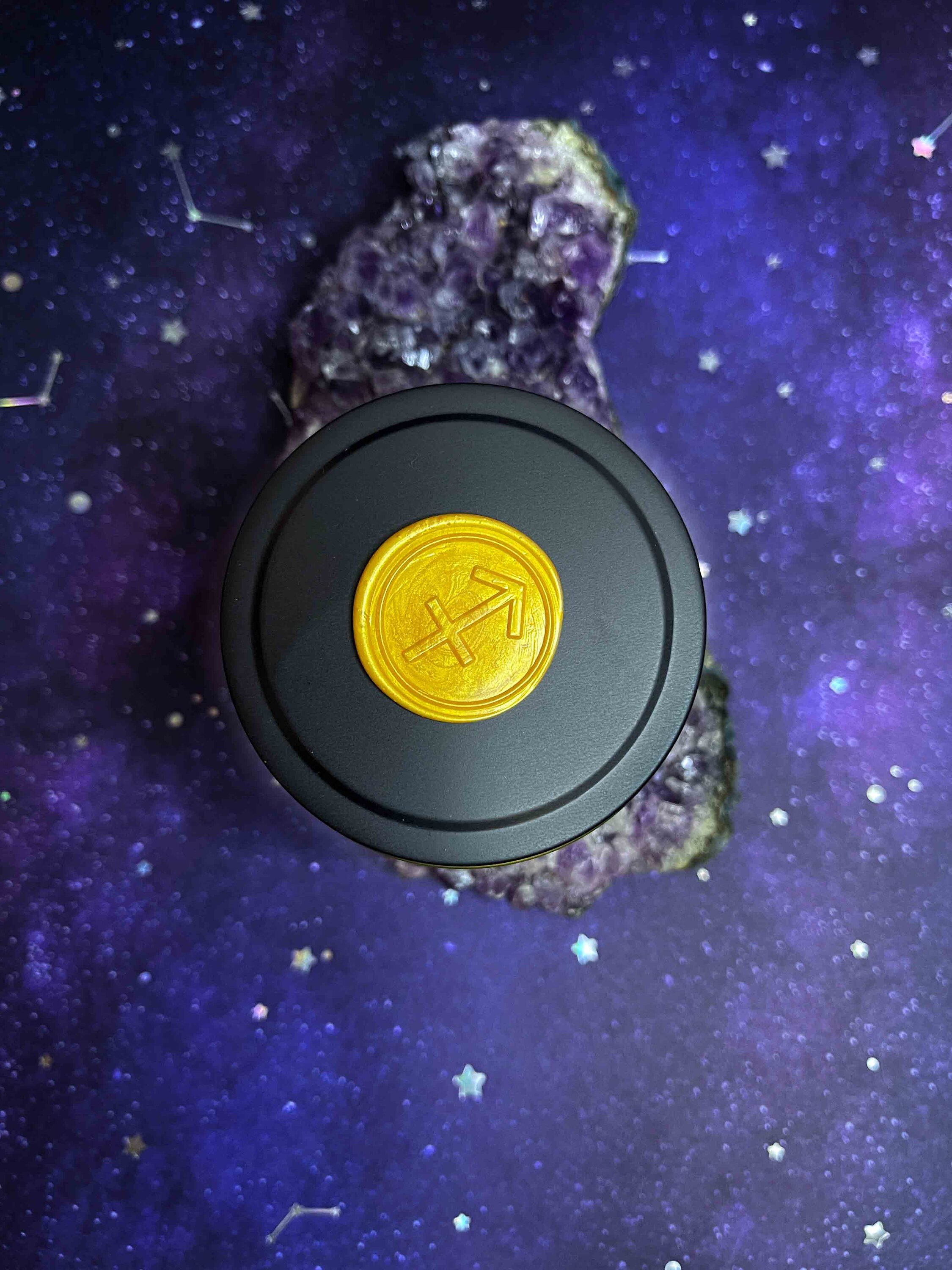 Each candle is hand-poured with all-natural soy wax and premium fragrance oils. Our products are made and set to cure before being sold, and individually labeled and finished by hand. These 4oz candles have a burn time of 20+ hours and have the perfect scent throw for an average-sized room. They come in a black tin jar with a luxurious mirrored holographic gold label. Each lid is finished with a gold wax stamp protection circle.